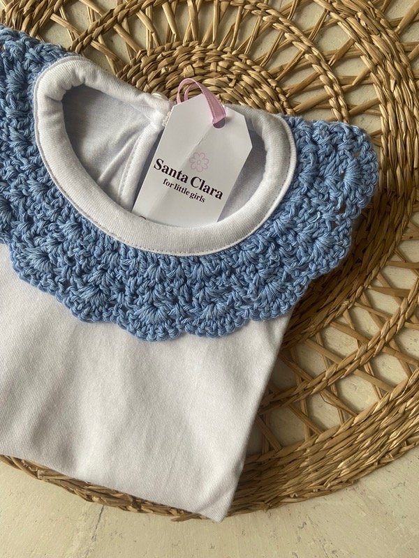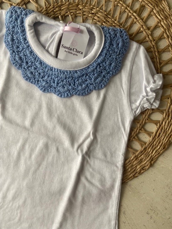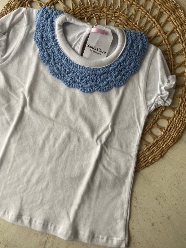 Remera de algodón manga corta con cuello tejido al crochet color azul